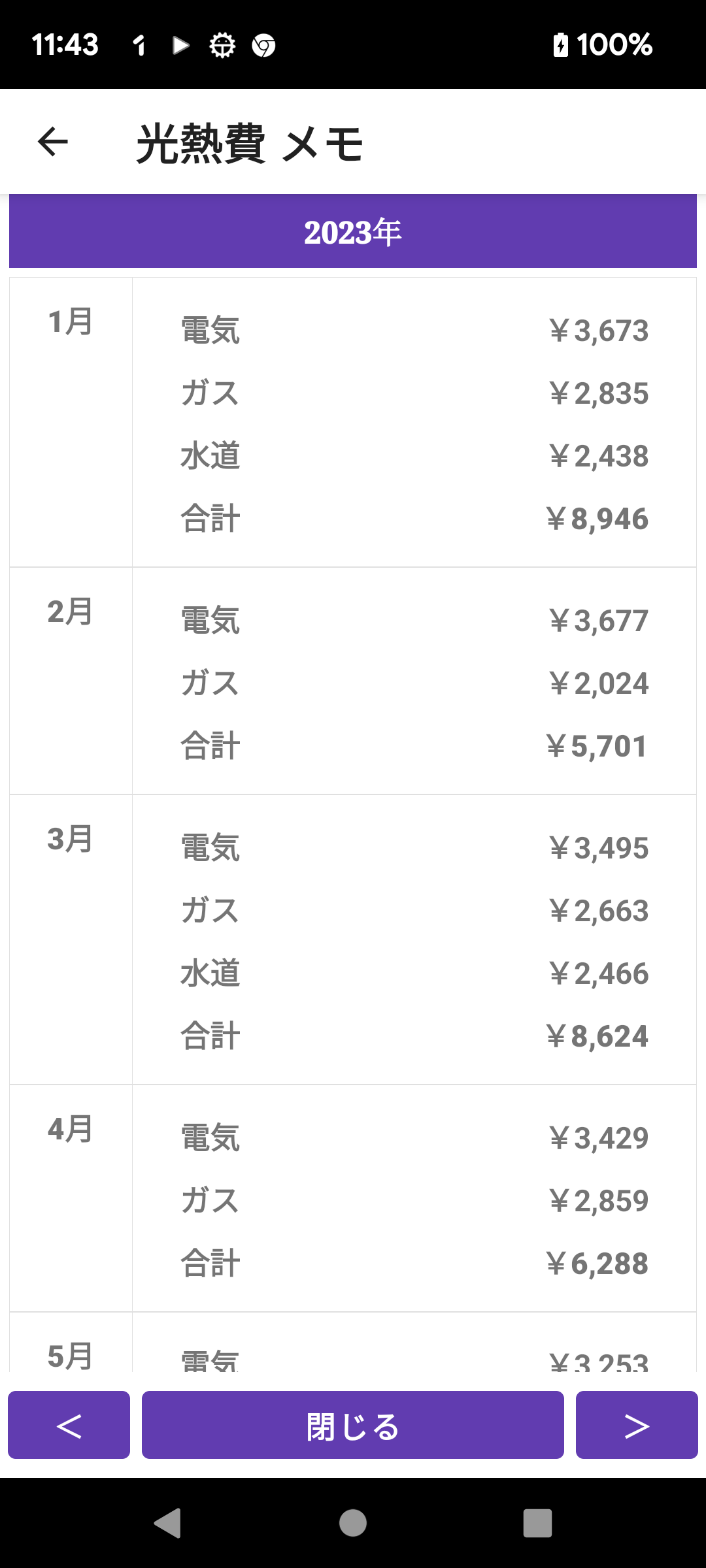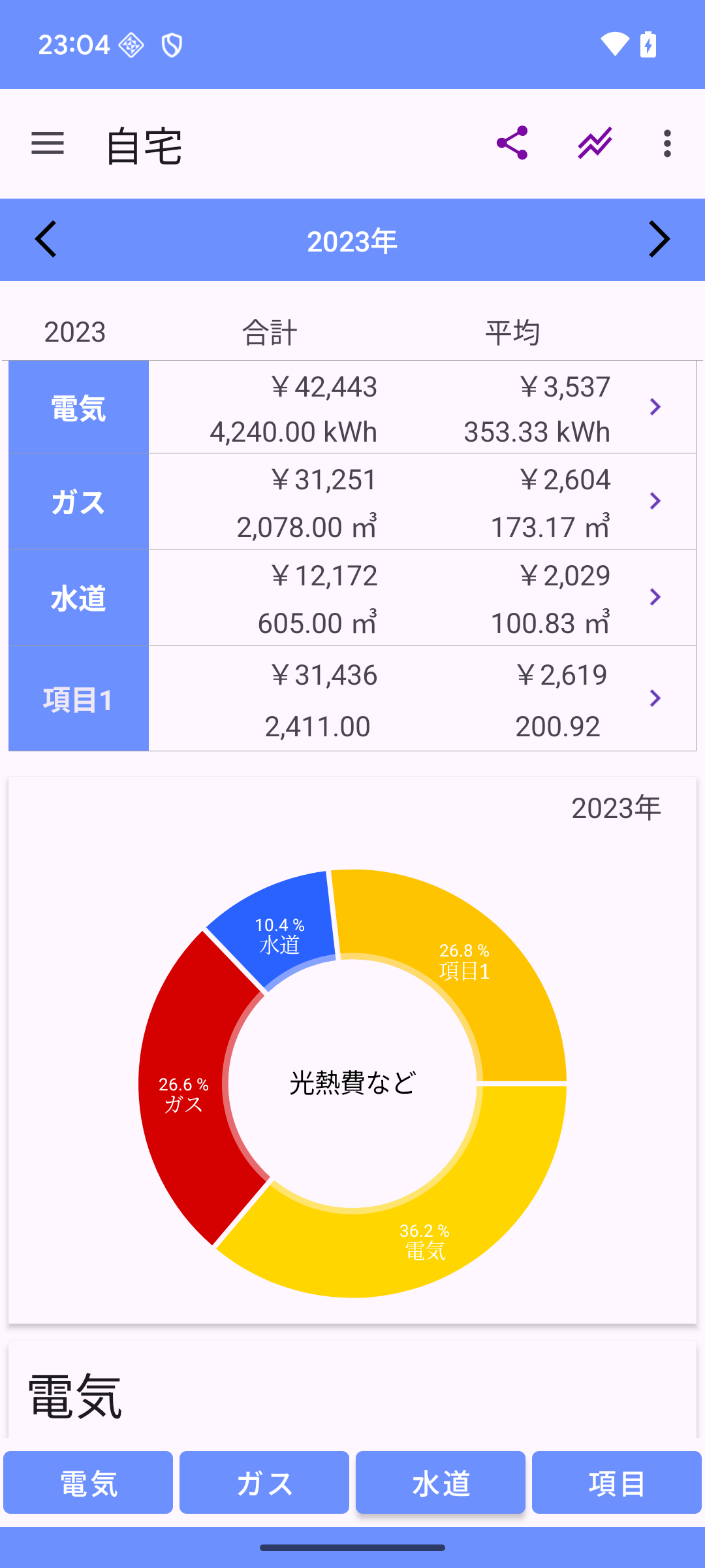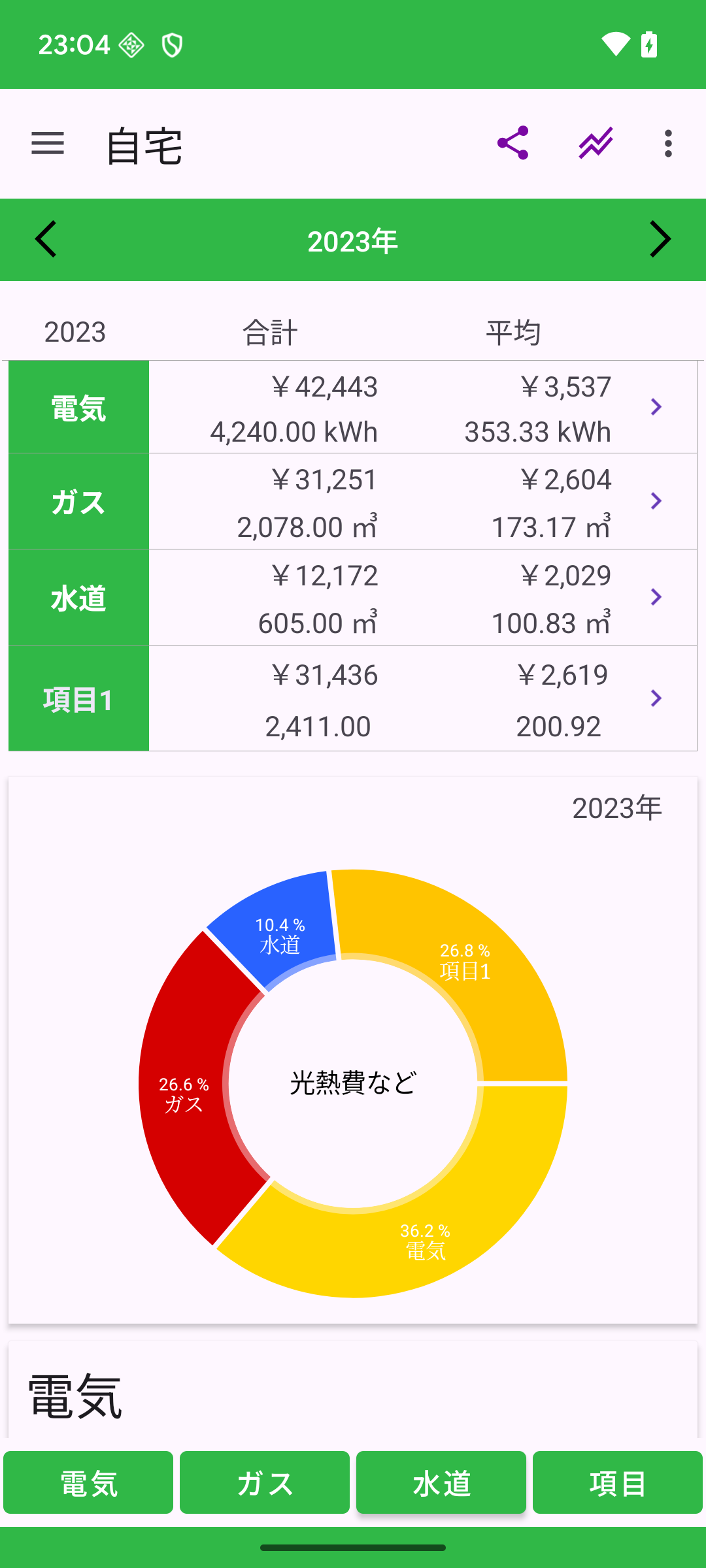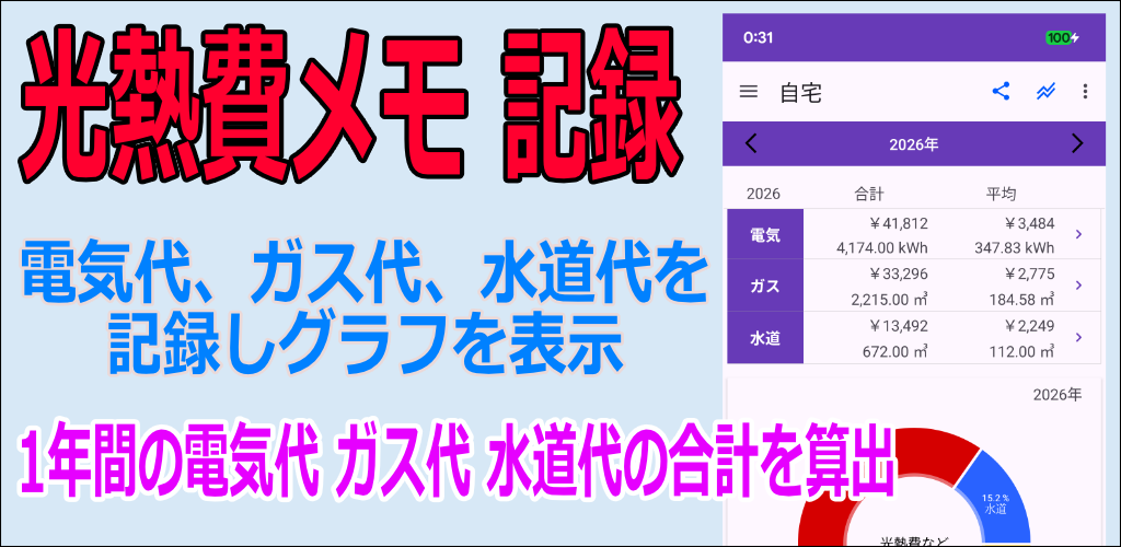 光熱費 記録帳 電気代、ガス代、水道代を記録しグラフを表示します。