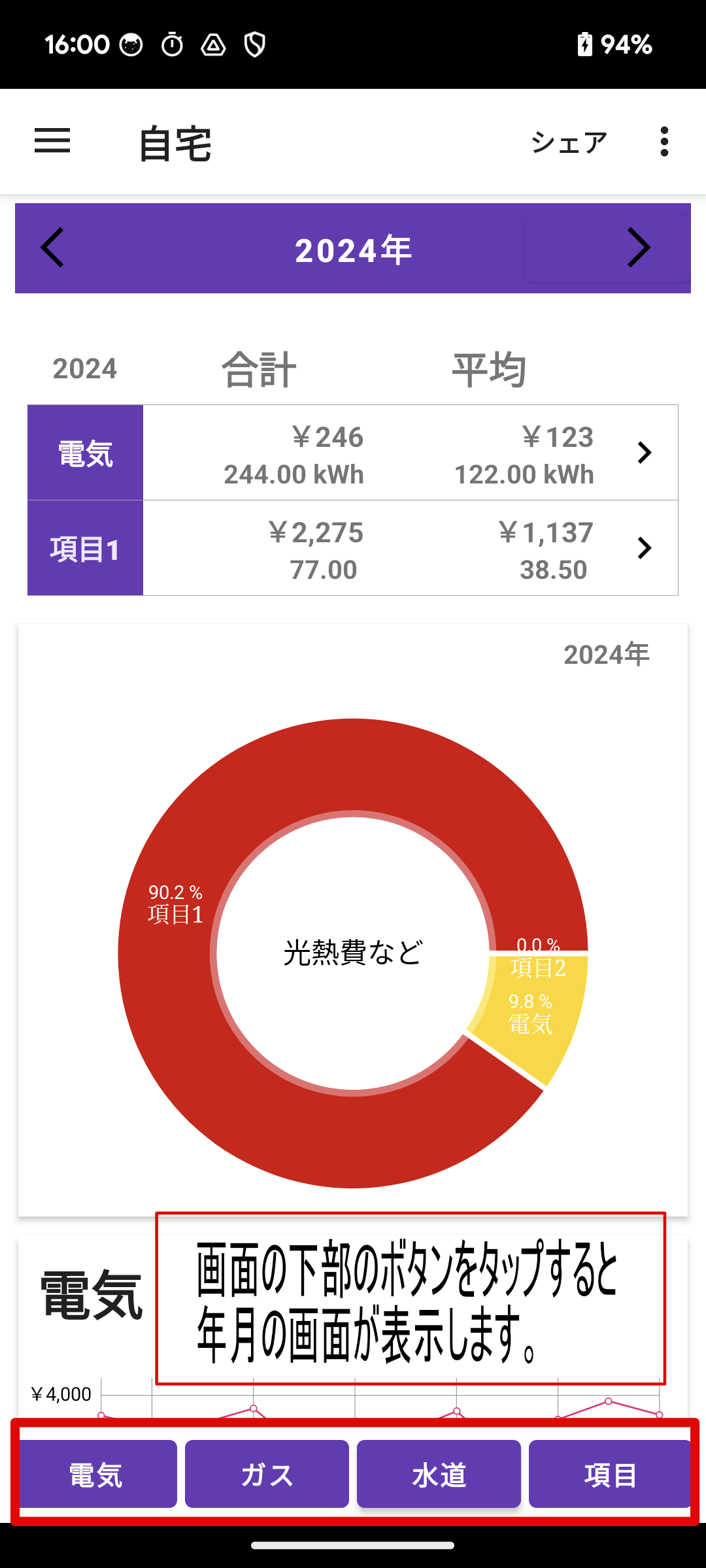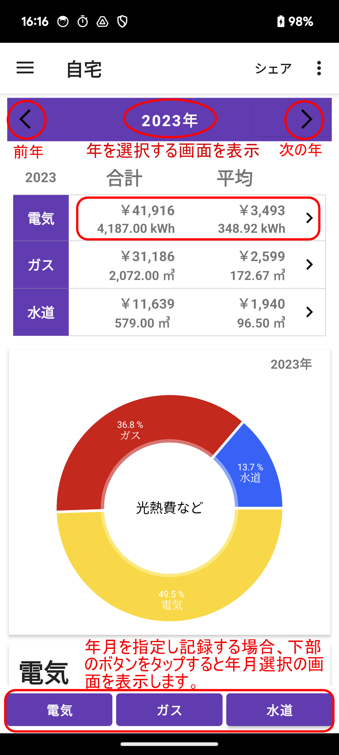 光熱費 下部のボタンから記録します