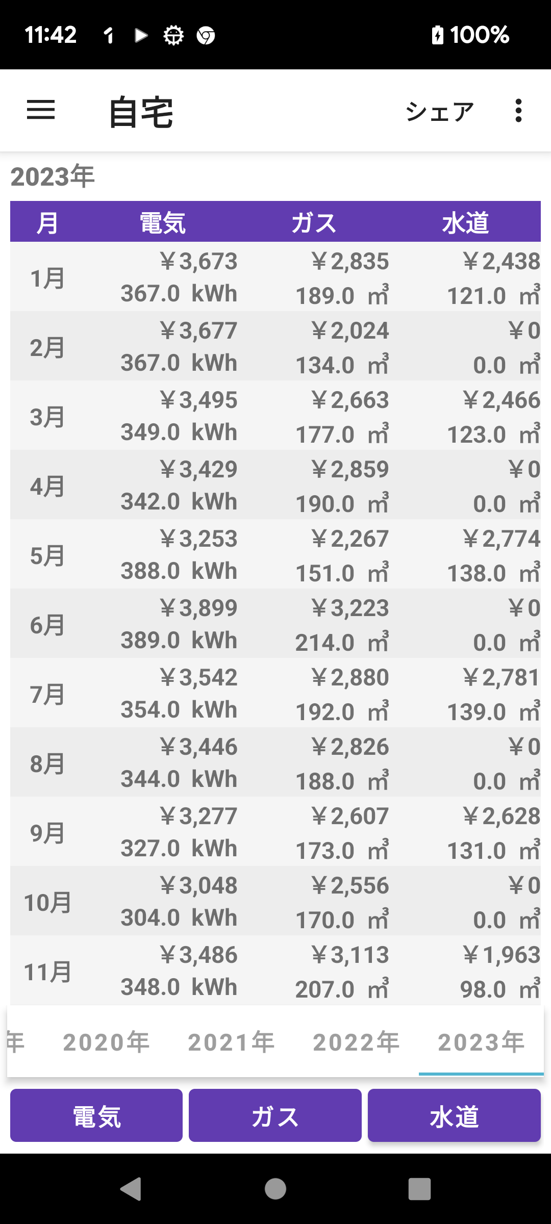 光熱費 電気・ガス・水道の金額と使用量の一覧