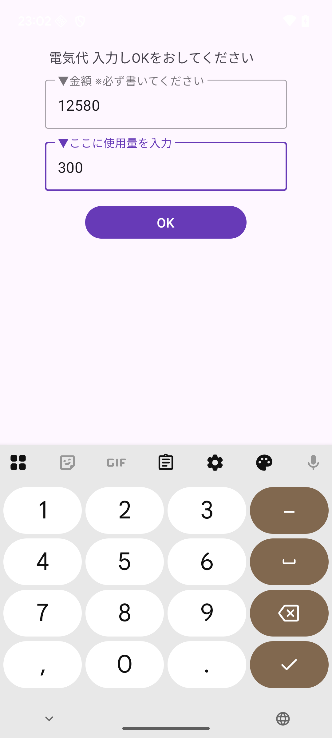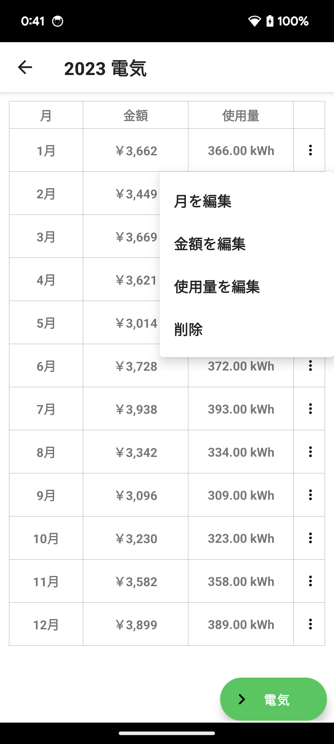 光熱費 電気 金額と使用量を入力する画面