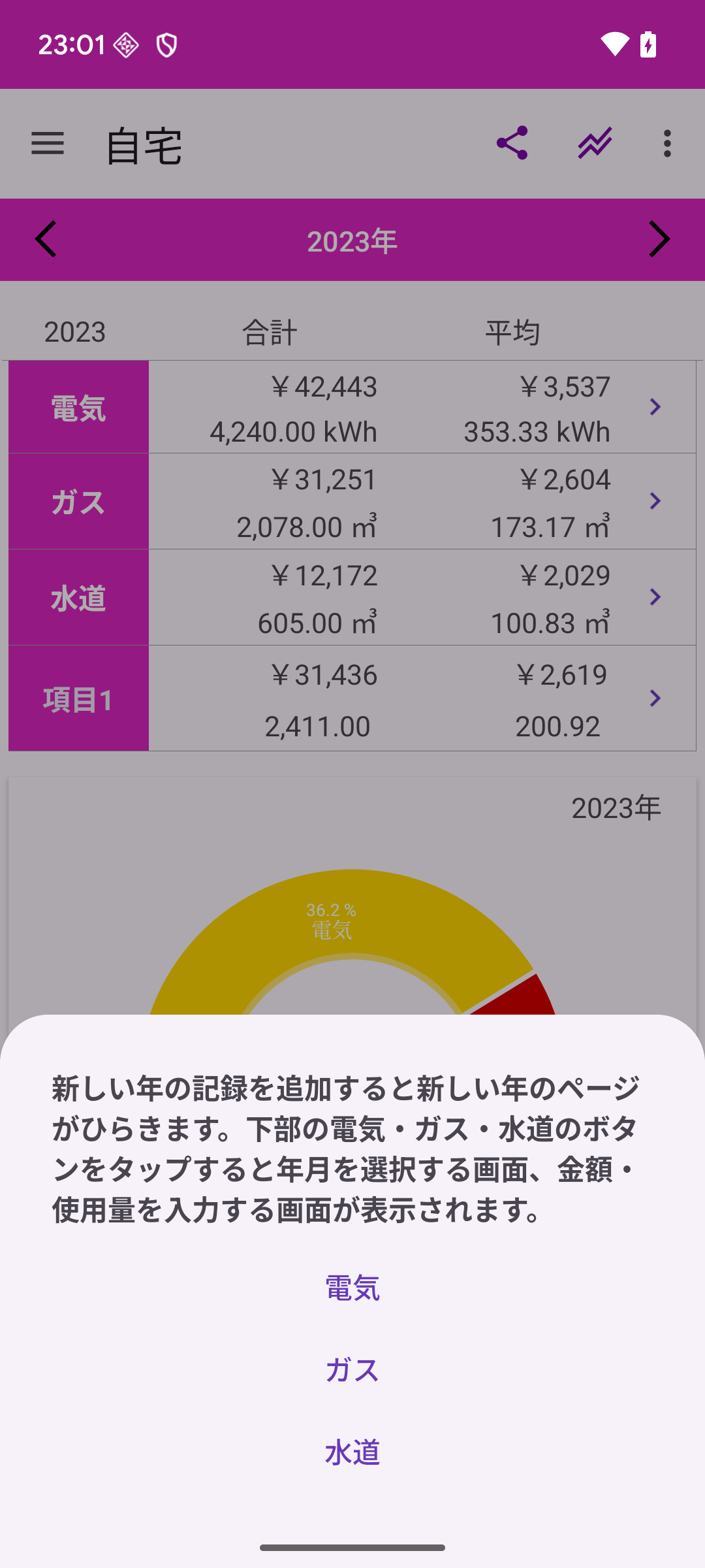 画面を右から左にスワイプすると次の年の画面を開きます記録がない場合は、「新しい年の記録を追加すると新しい年のページが開きます。下部の電気・ガス・水道のボタンをタップすると年月を選択する画面、金額・使用料を入力する画面が表示されます。」の画面が表示されます。