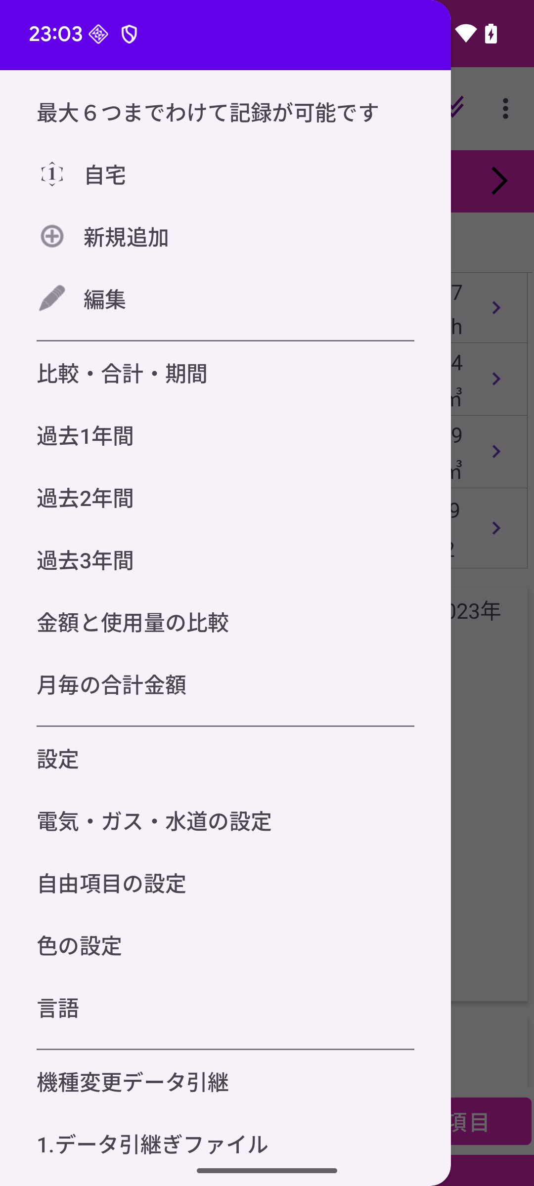光熱費の記録を複数の住居(最大6つ)にわけて記録が可能