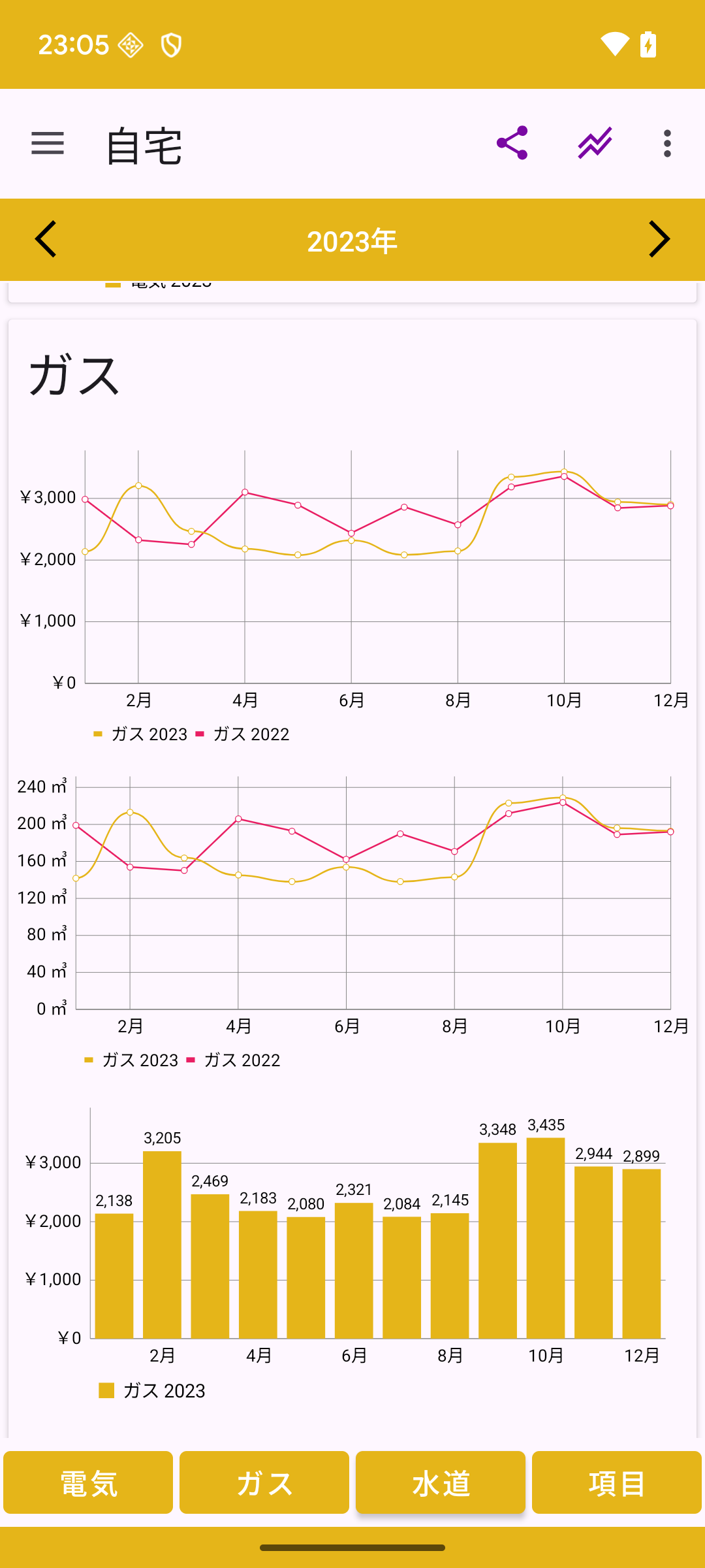 棒グラフと線グラフで光熱費を確認することで、どの月に使用量/金額が多いのか把握することができます。