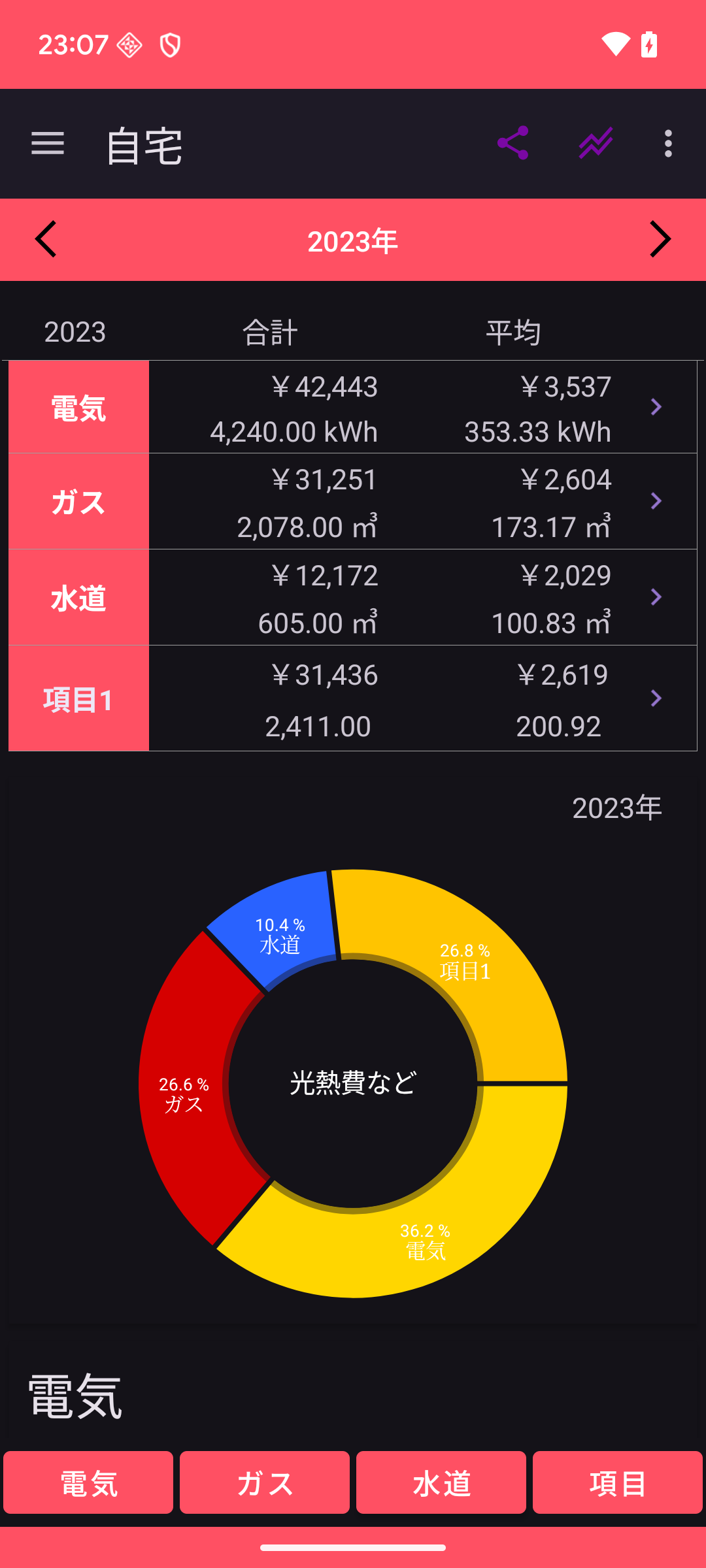 光熱費 サーモンピンク色の画面