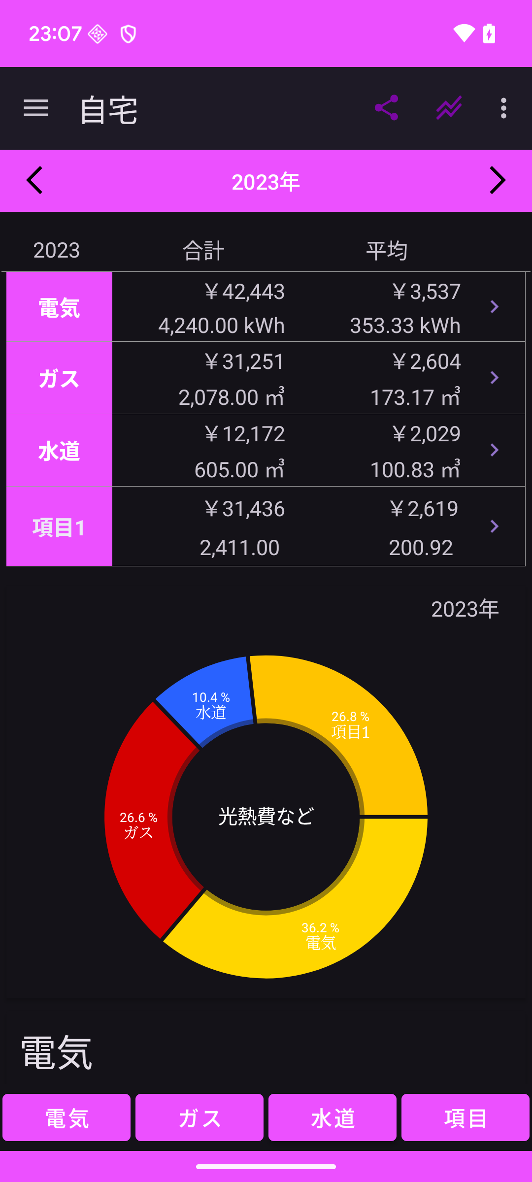 光熱費 ダークテーマON時の画面