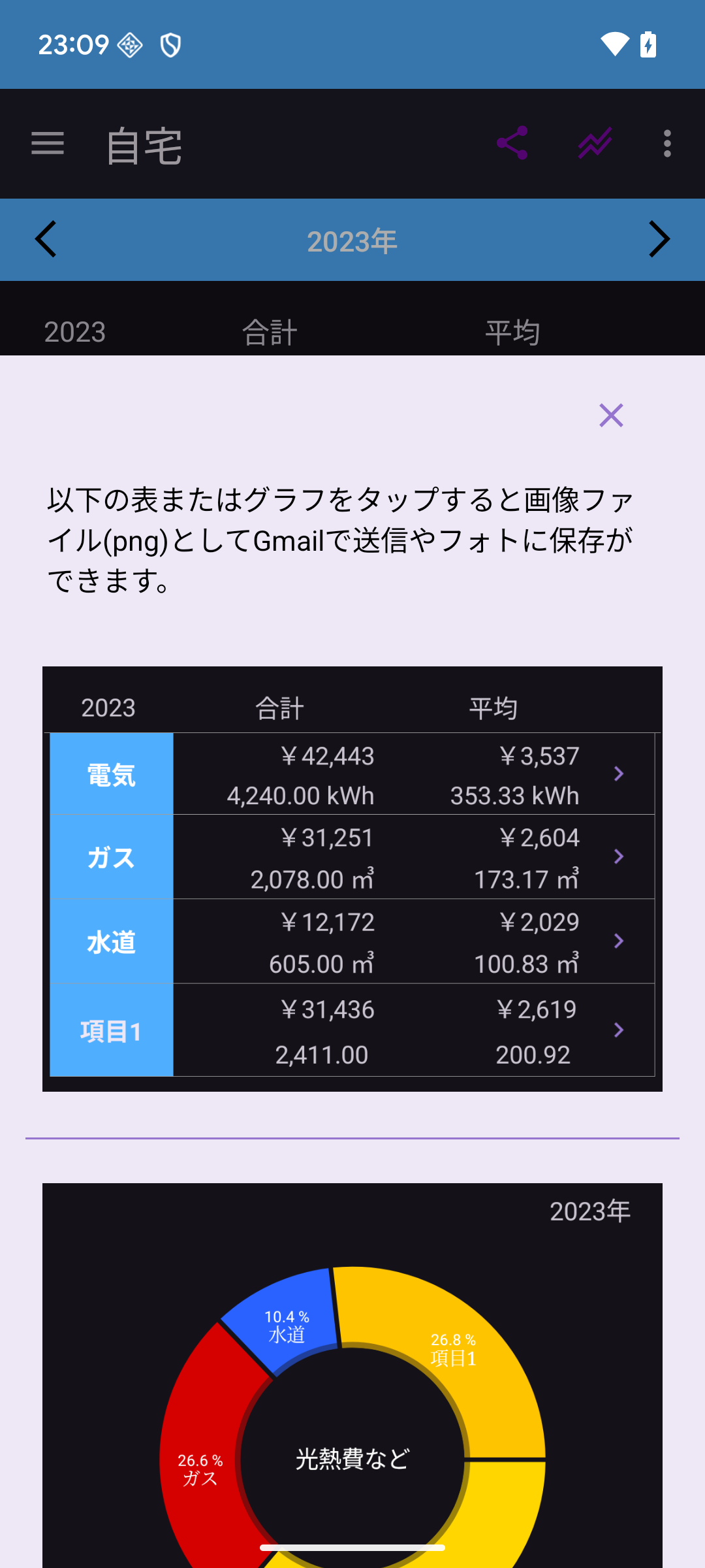 光熱費 画面の表またはグラフを画像ファイルPNGとして作成しGmailで送信やフォトに保存ができます。