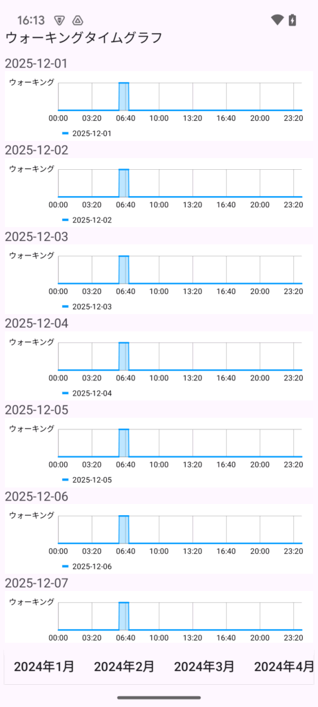 歩数計の機能はないので、お手持ちの歩数計で計測した歩数を入力してください。記録したウォーキングの歩数はグラフで確認できるのでいつどのくらい歩いたかを把握できます。
