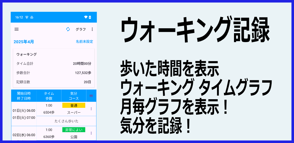 ウォーキングの開始日時と終了日時を記録しタイムを計算するアプリです。歩数は追加で入力することで記録できます。