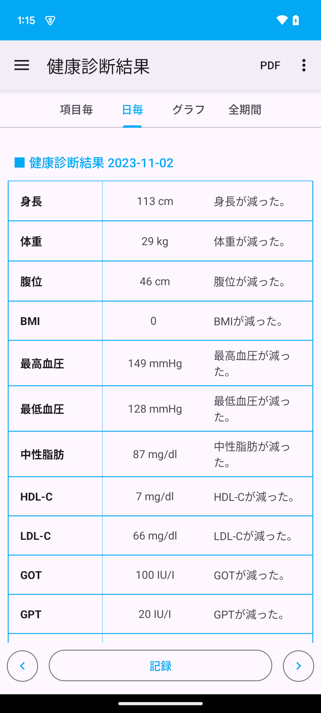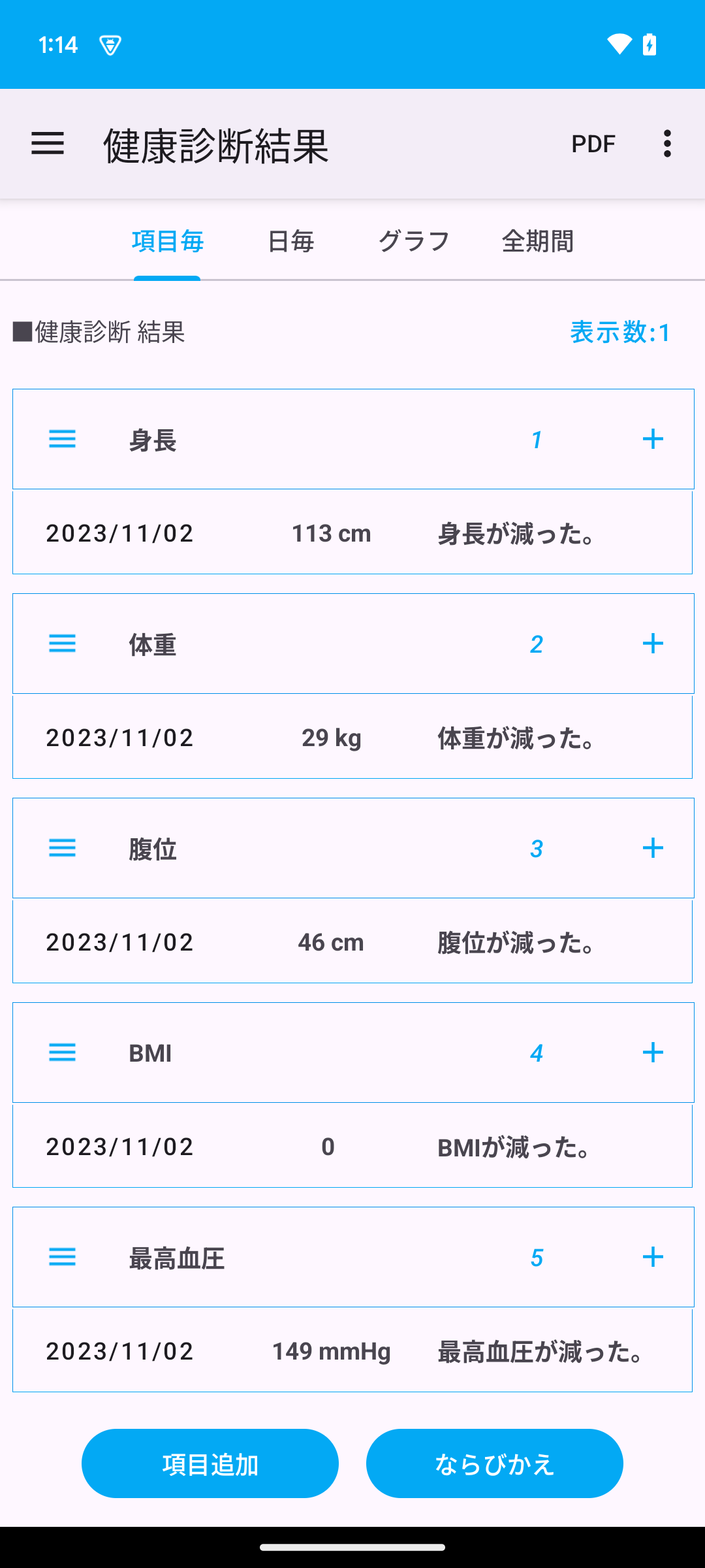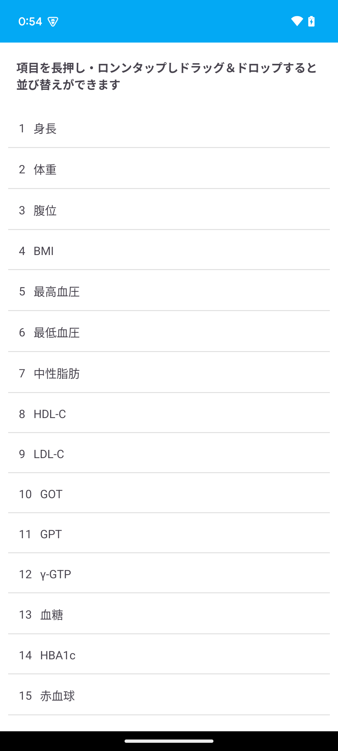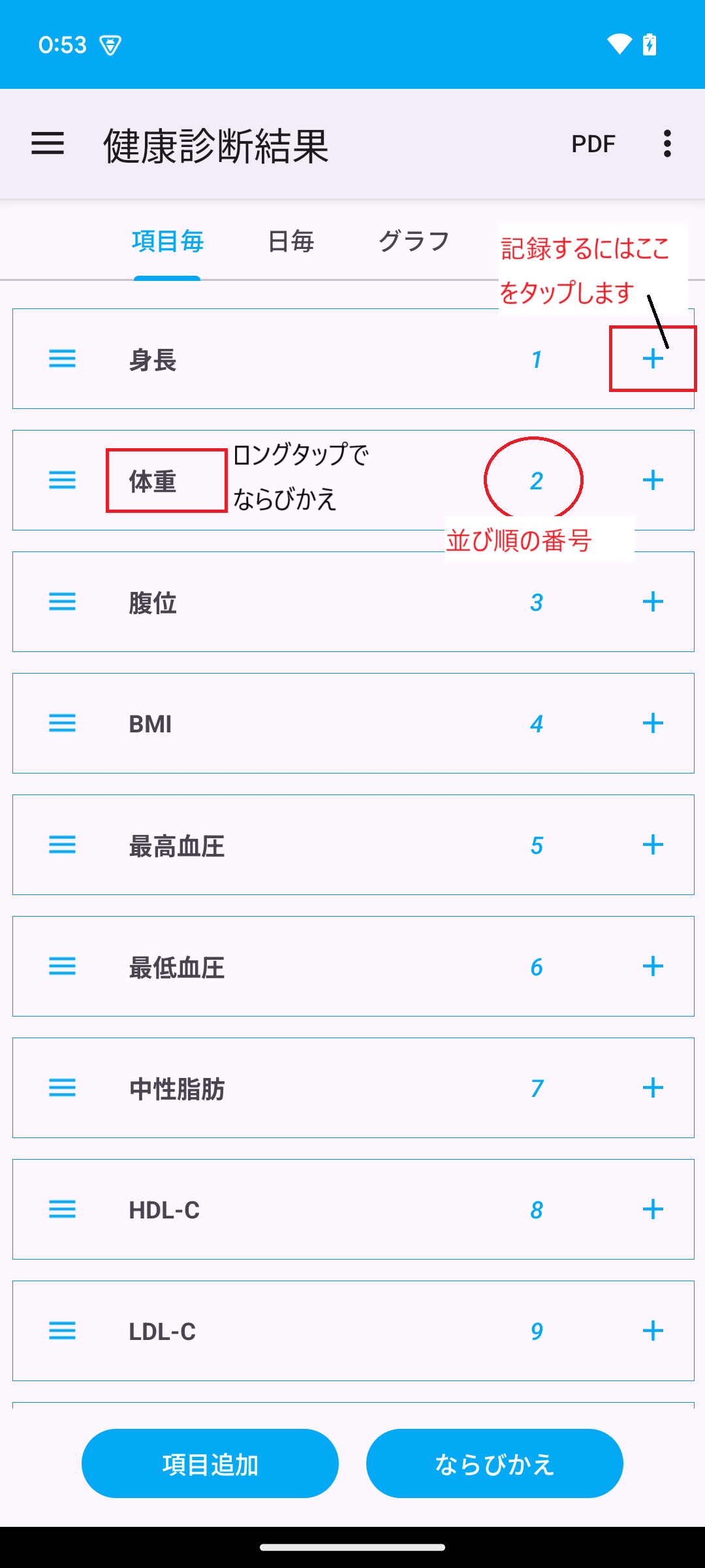 健康診断の項目は50まで追加できます。記録は手入力でおこないます。
