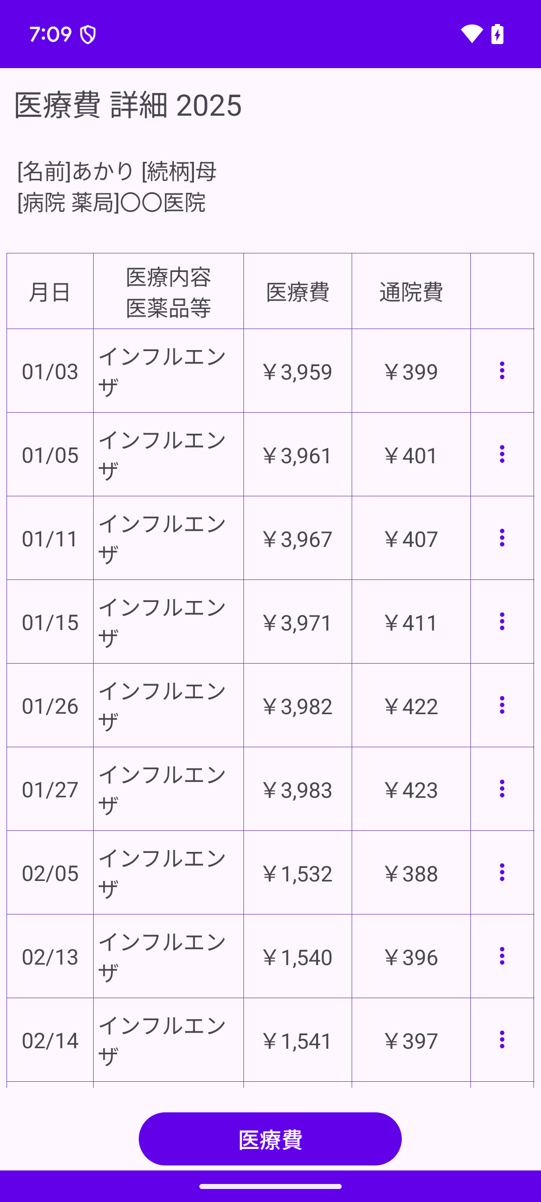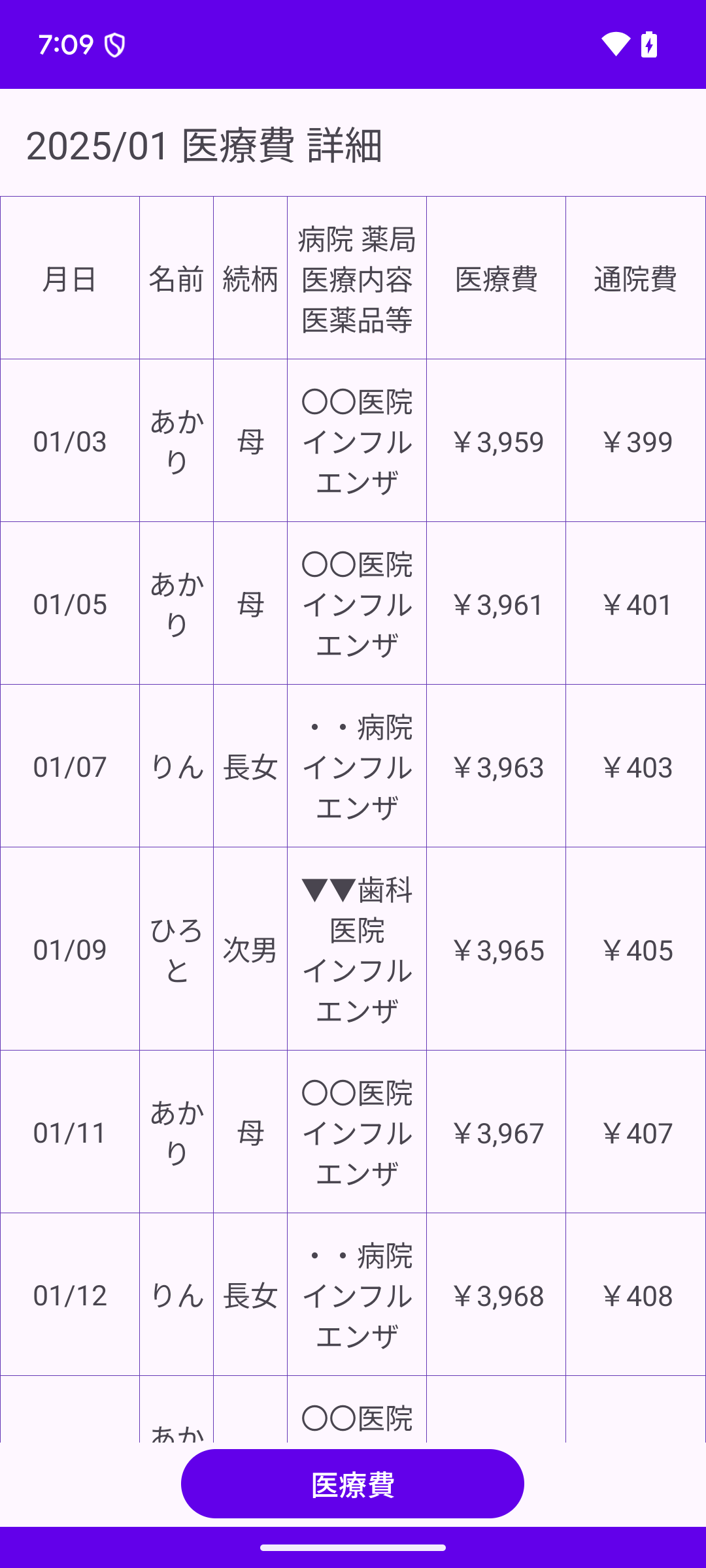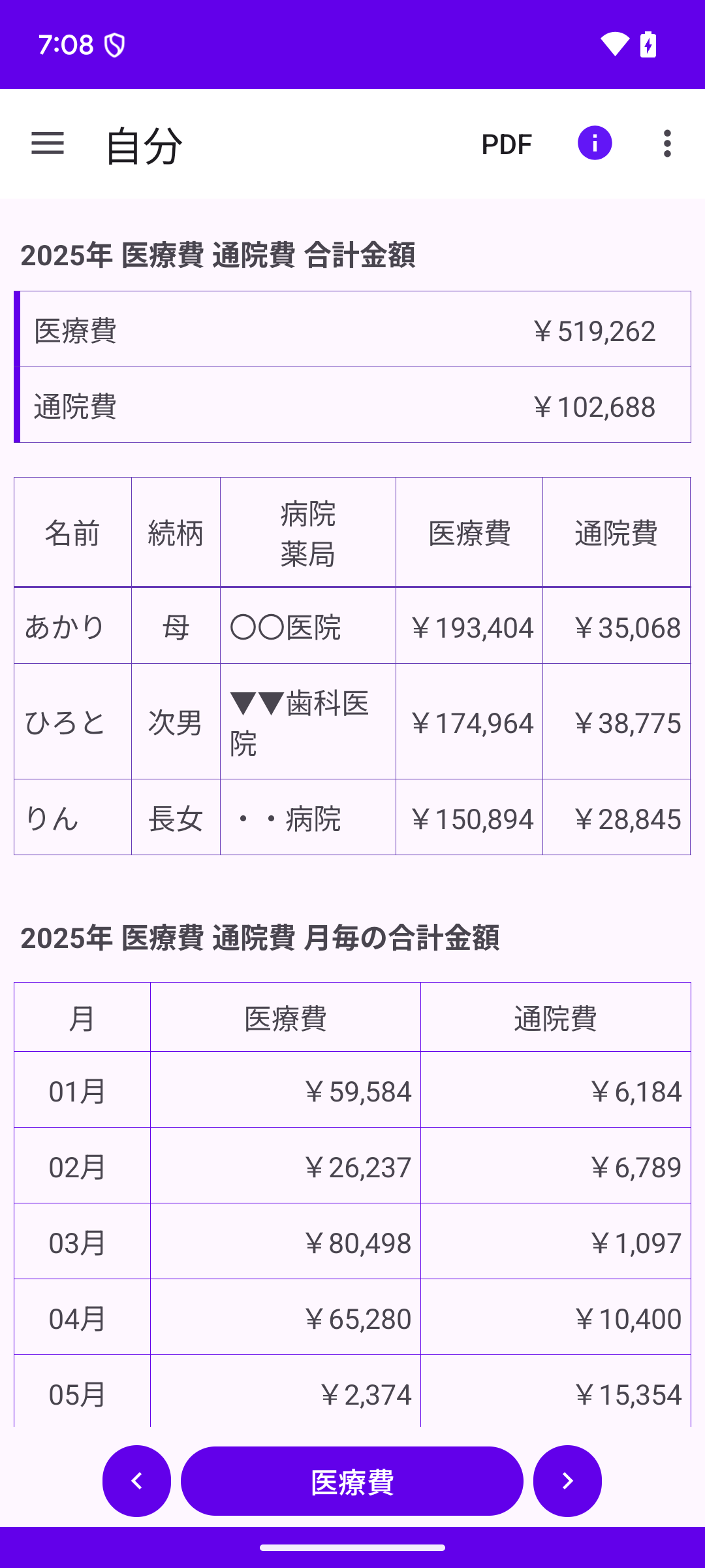 「名前と病院・薬局」毎の表、各月毎の表、医療費のグラフ 通院費のグラフを表示します。