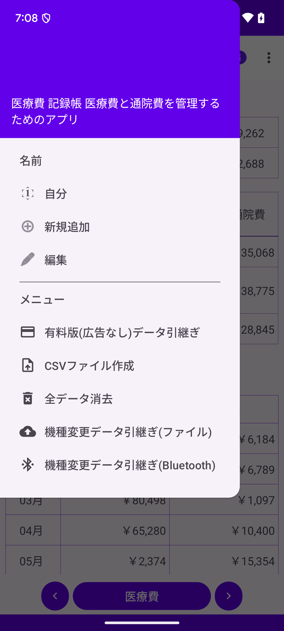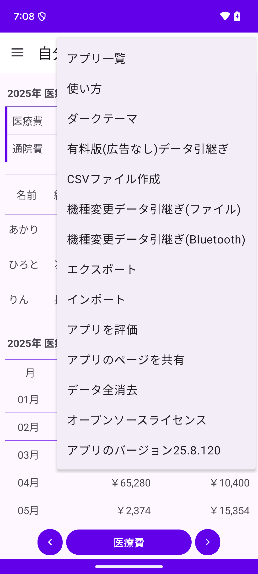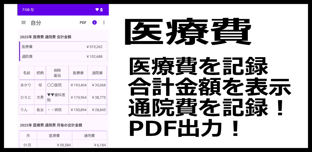 「名前と病院・薬局」毎の表、各月毎の表、医療費のグラフ 通院費のグラフを表示します。