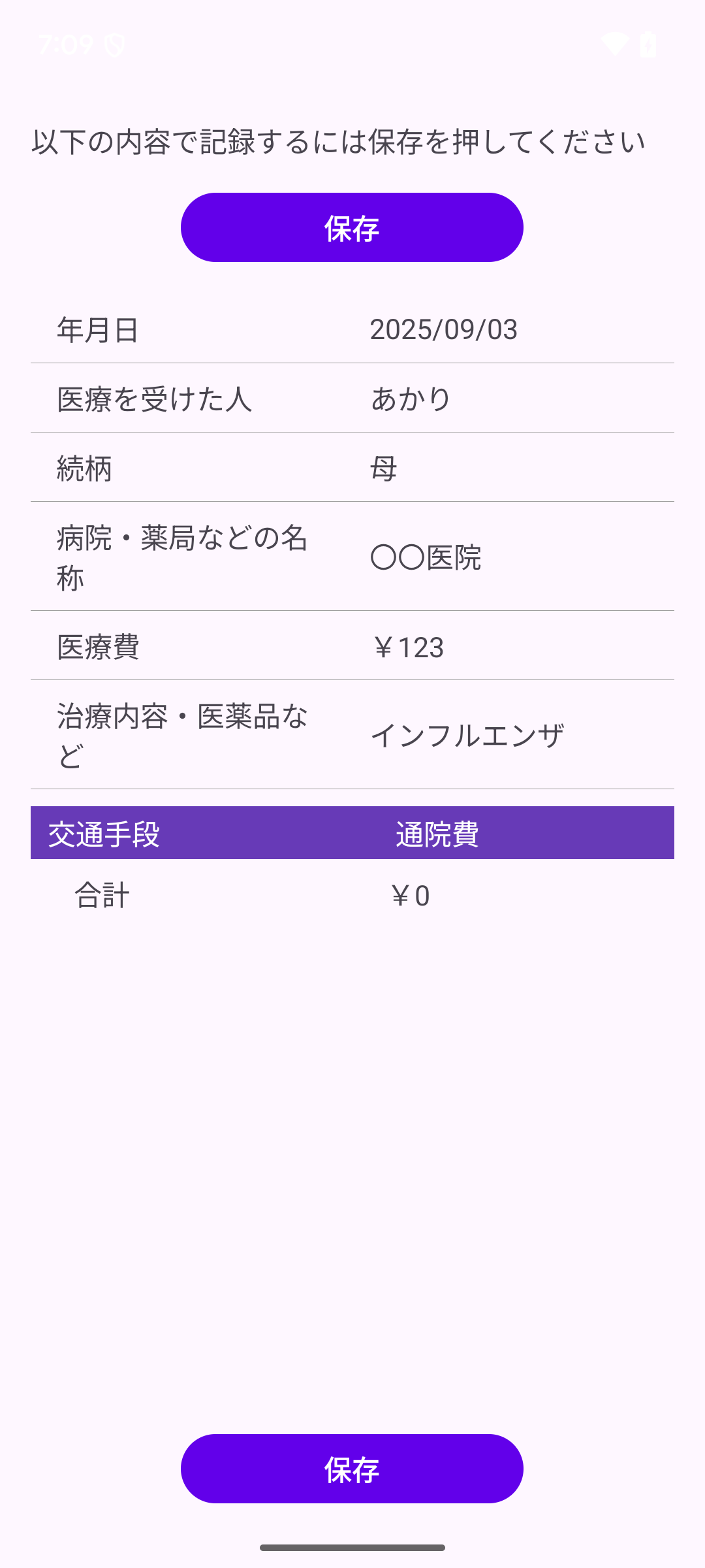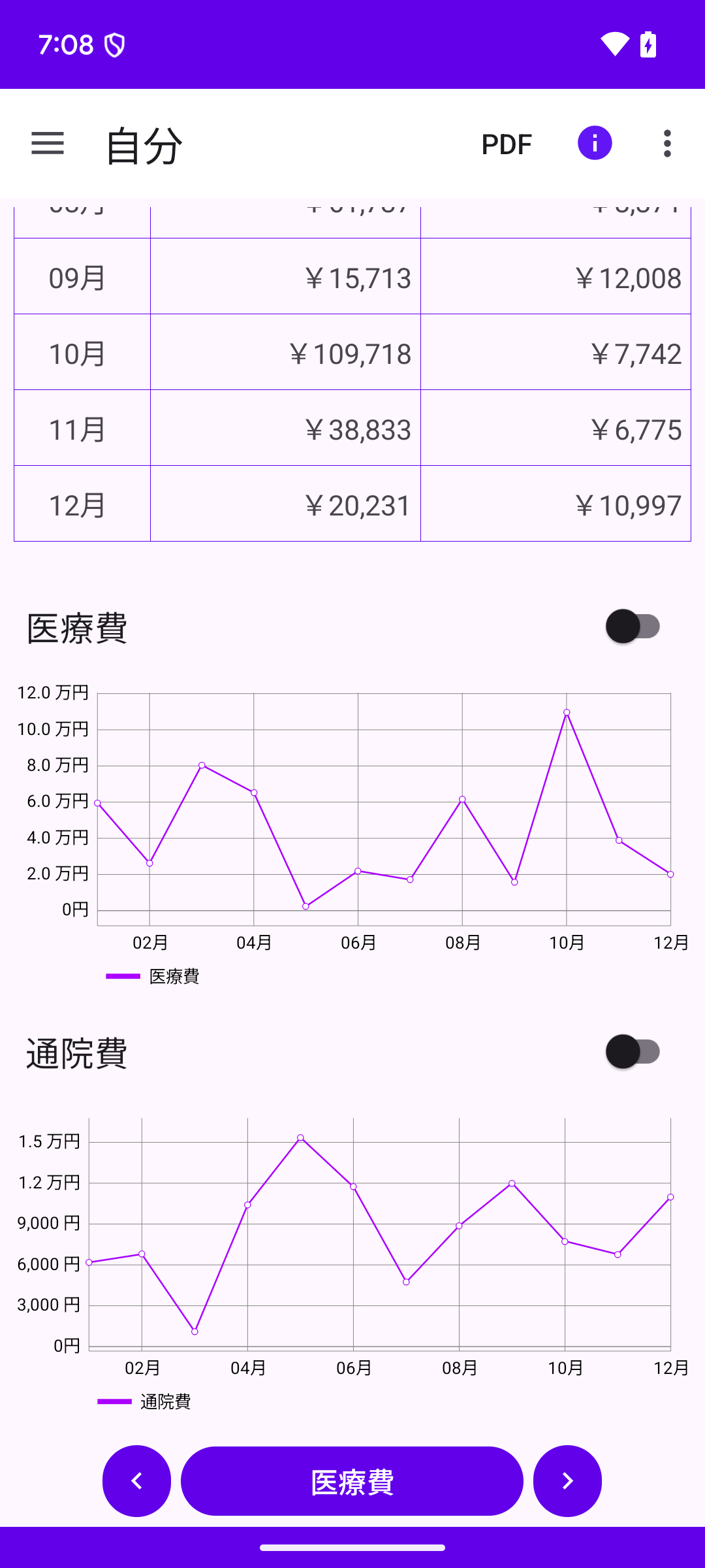 月毎の医療費の線グラフを確認することで、どの月にどのくら医療費と通院費がかかったのかを把握することができます。