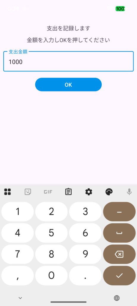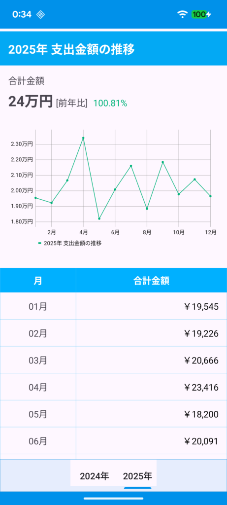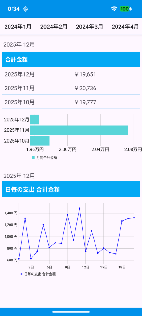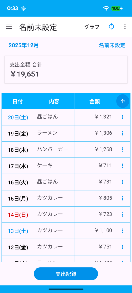 支出 記録帳 月間合計金額 日毎の合計金額の線グラフ