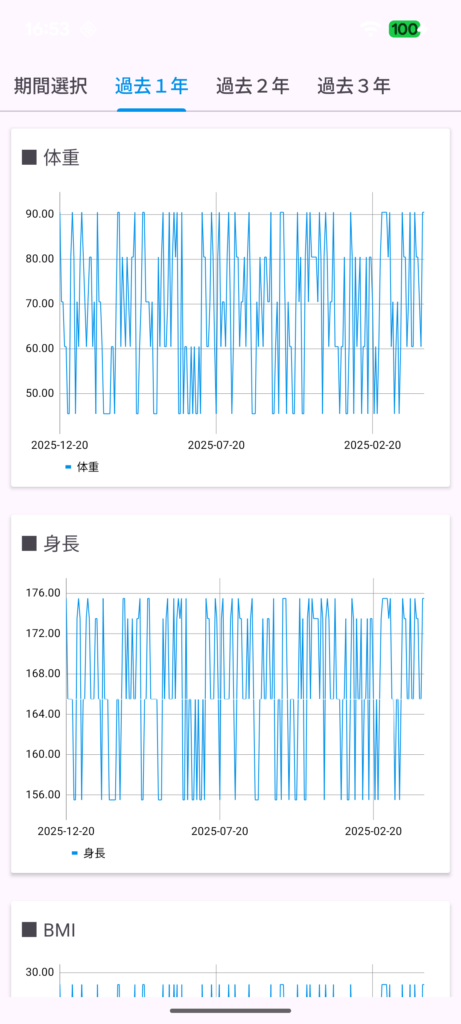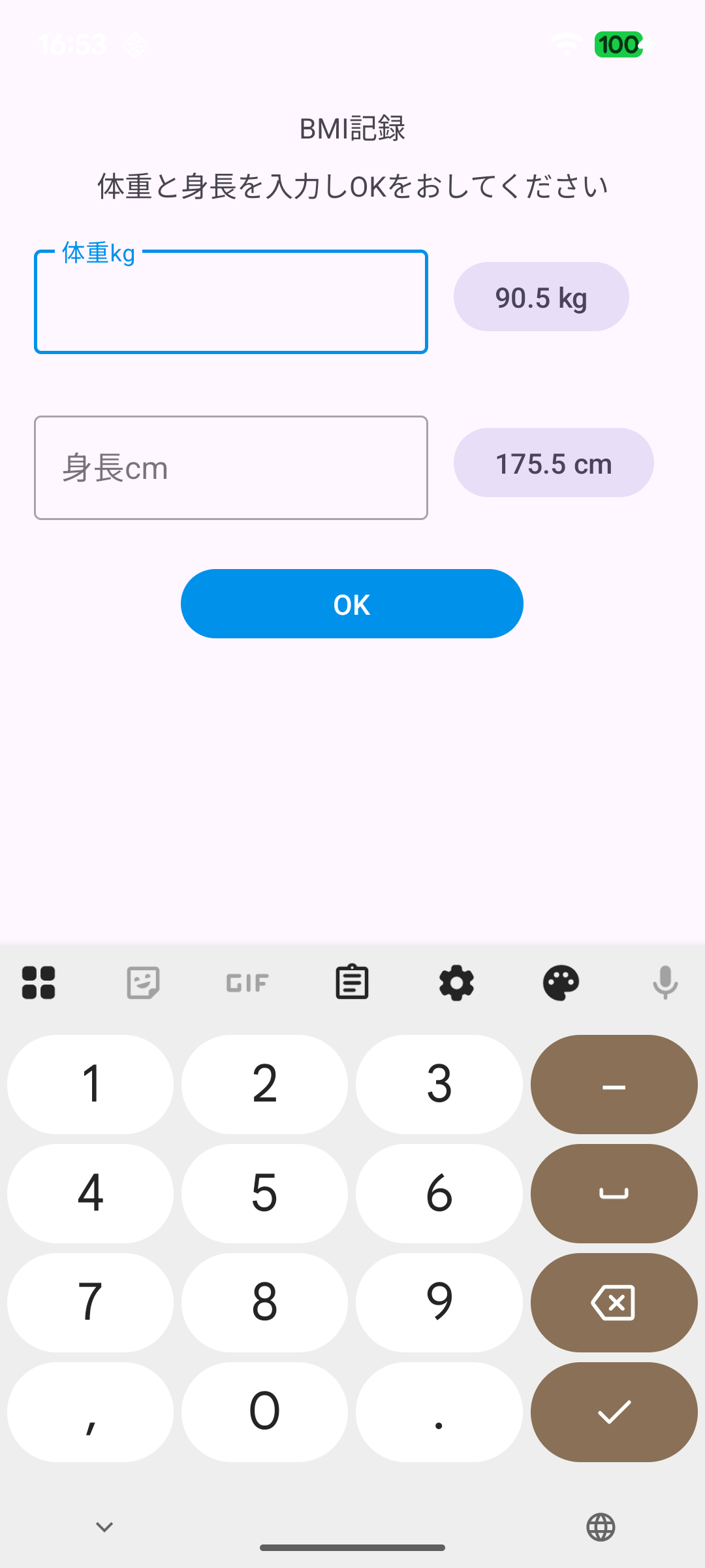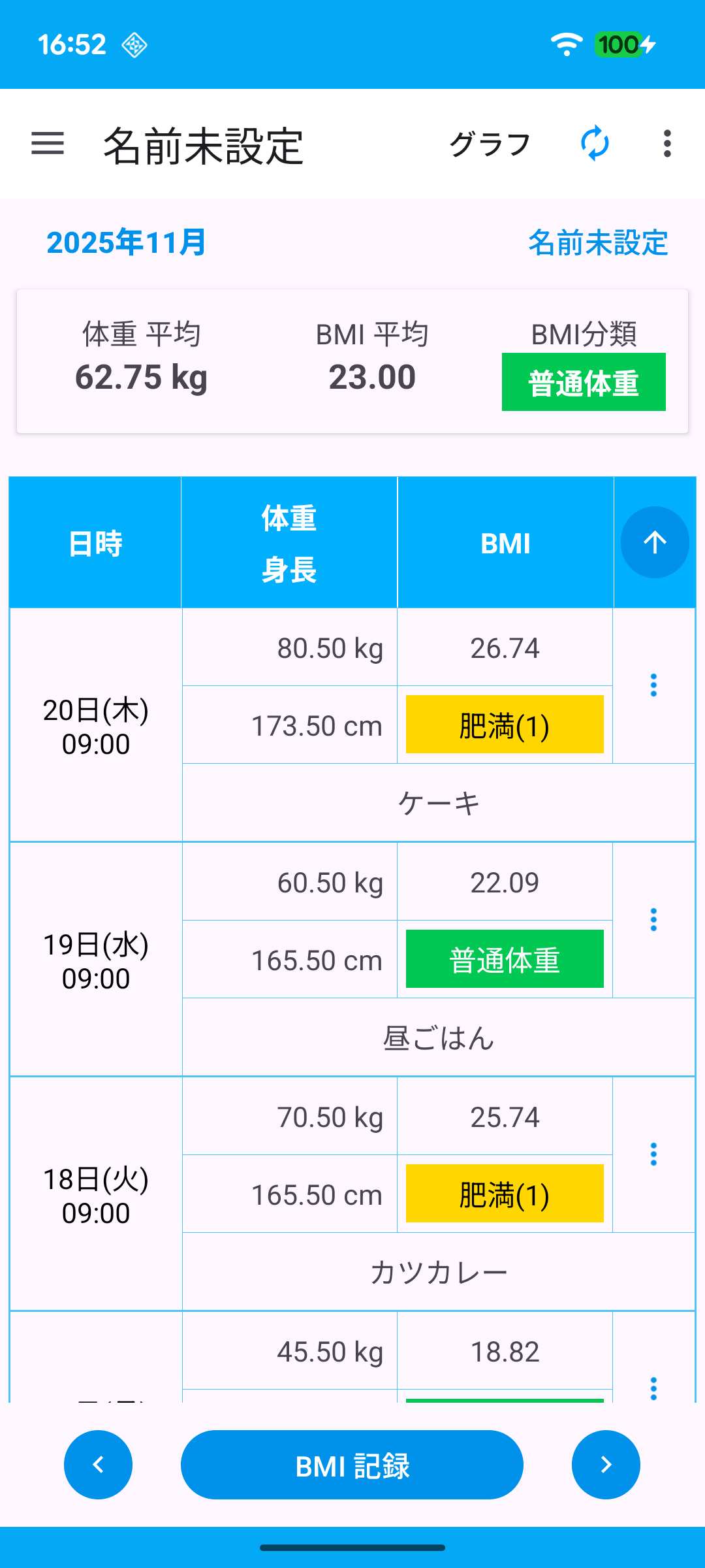 BMI 記録帳 体重と身長よりBMIを計算して表示します体重と身長とBMIを線グラフで表示します。BMIの分類(低体重、普通体重、肥満)を表示します。 BMI 記録帳アプリはGoogle playでインストールできます BMI 記録帳 トップ画面 体重と身長を入力する画面 右側に過去の体重と身長のボタンがあります。 ボタンを押すとその数値が入力されます。 過去3か月のBMIの平均と月間のBMIグラフ 体重と身長とBMIの線グラフ BMI 記録帳アプリはGoogle playでインストールできます