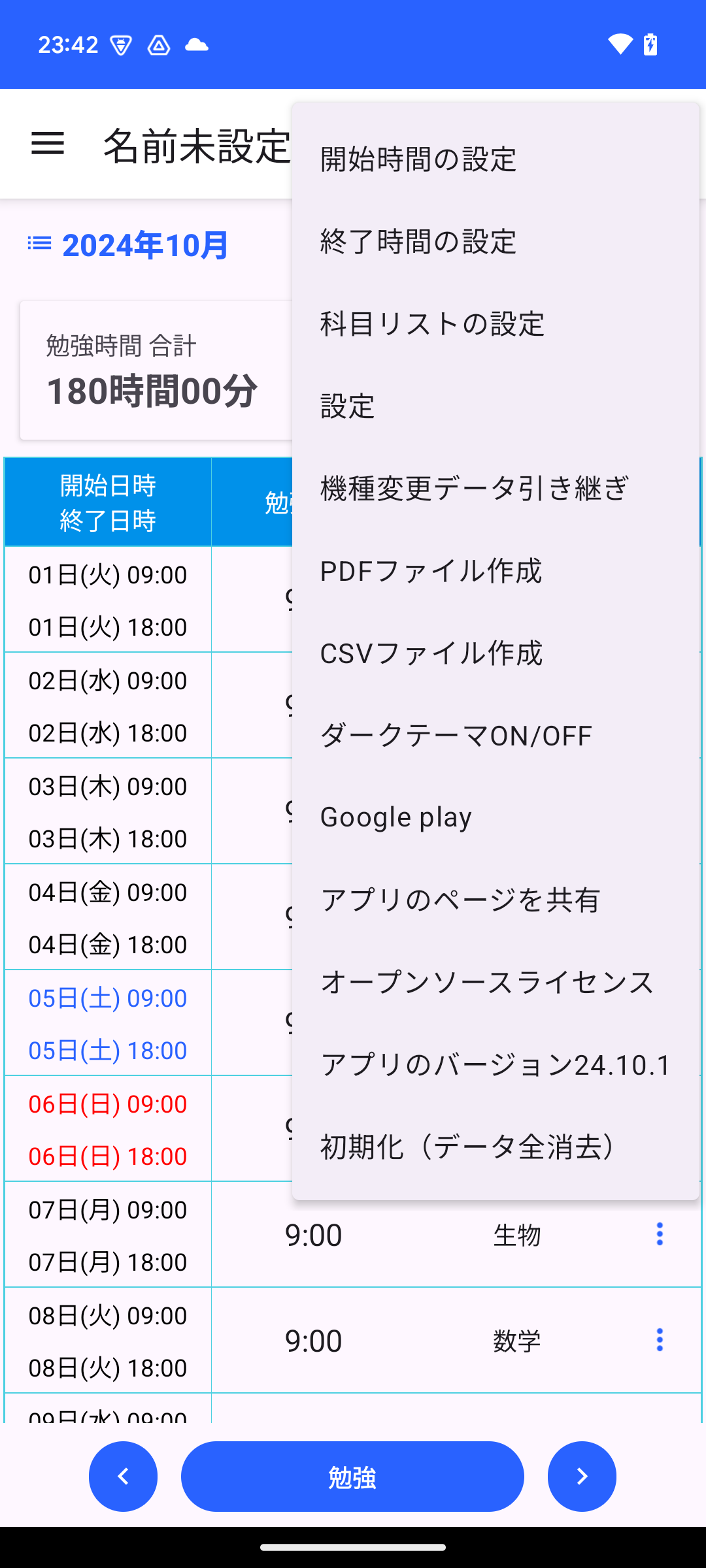 勉強時間アプリのメニュー