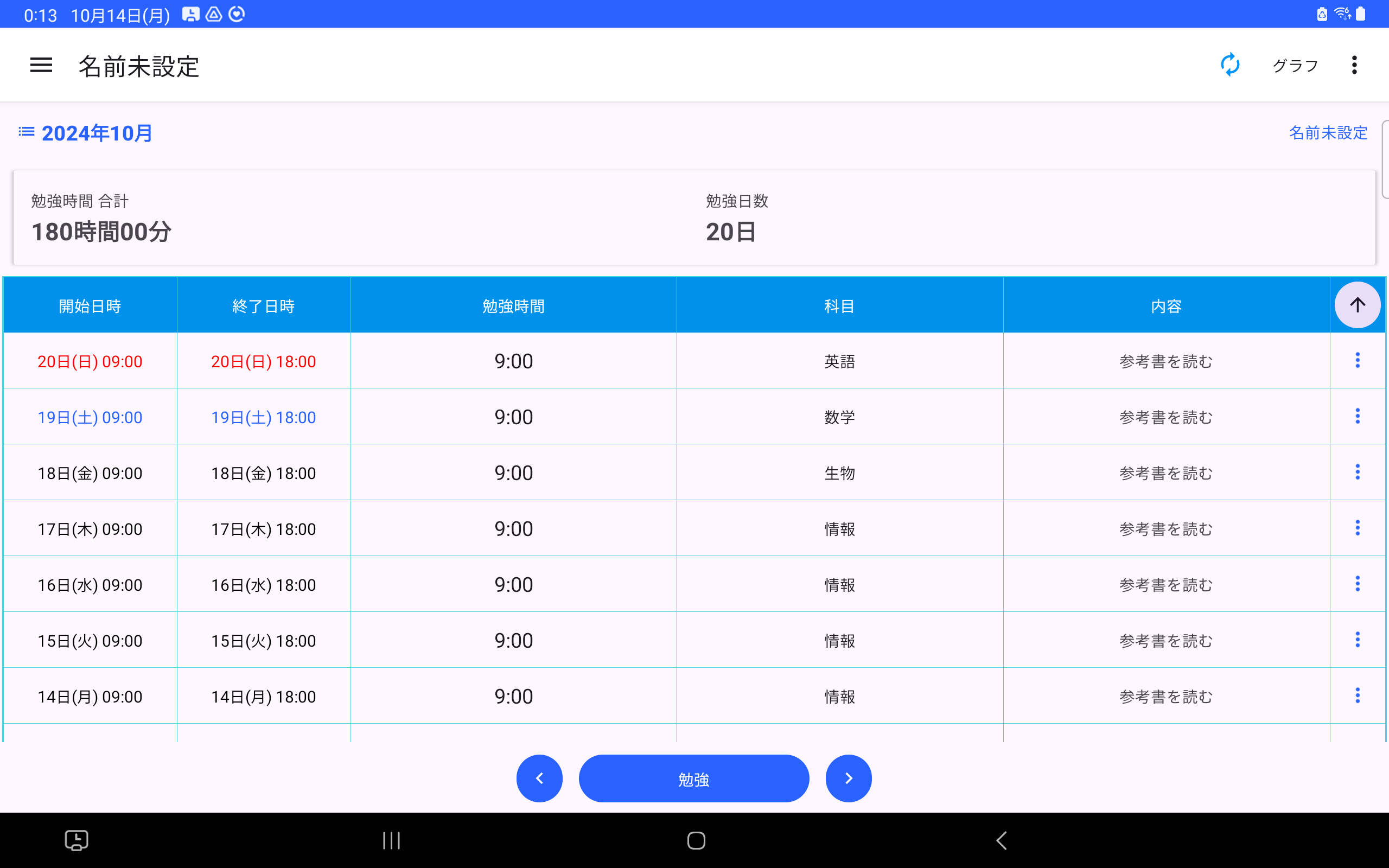 勉強時間 記録帳 タブレット横画面